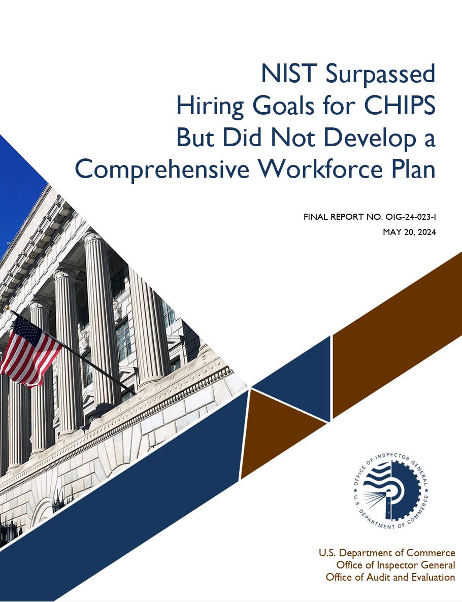 The IG report both praised and chastised us. On the one hand, the IG acknowledged that we had surpassed our hiring goals for both the CHIPS Program Office (CPO) and the CHIPS Research and Development Office (CRDO), and outlined how the Office of Human Resources Management increased staffing to support our hiring surge. But the report put greater emphasis on our failure to document our workforce plan. The expectation was that we should waste precious capacity on documentation, rather than on the work of actually hiring folks.